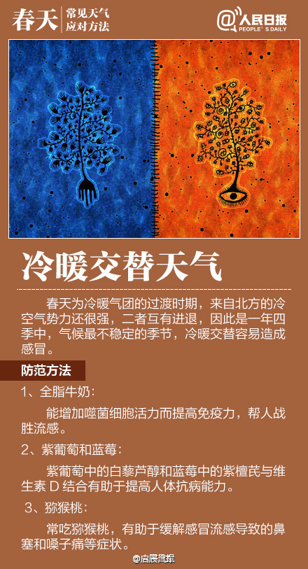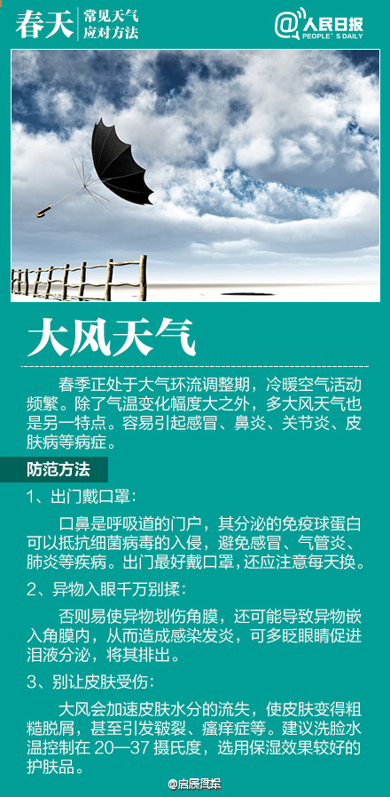 如何應對初春多變天氣作者:合眾電氣發布時間:2016-03-23瀏覽量:11242 次字體顯示:【大】【中】【小】 春季天氣調皮,昨天還日光融融閑賞花,今日就寒風瑟瑟緊添衣!大風、沙塵、陰雨等交替上演,讓感冒、過敏、關節炎等進入高發期。今天#世界氣象日#,四張圖教你應對春季多變天氣! 上一篇: HZXC-104D變壓器智能控制箱最新發貨現場下一篇: 面對問題疫苗,我們怎么辦?
