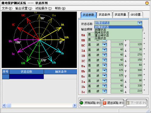 在微機繼電保護測試儀(鍵盤版)界面右邊的“狀態(tài)參數”屬性頁中設置當前狀態(tài)的狀態(tài)名稱、輸出頻率和各通道的輸出類型、幅值、相位。