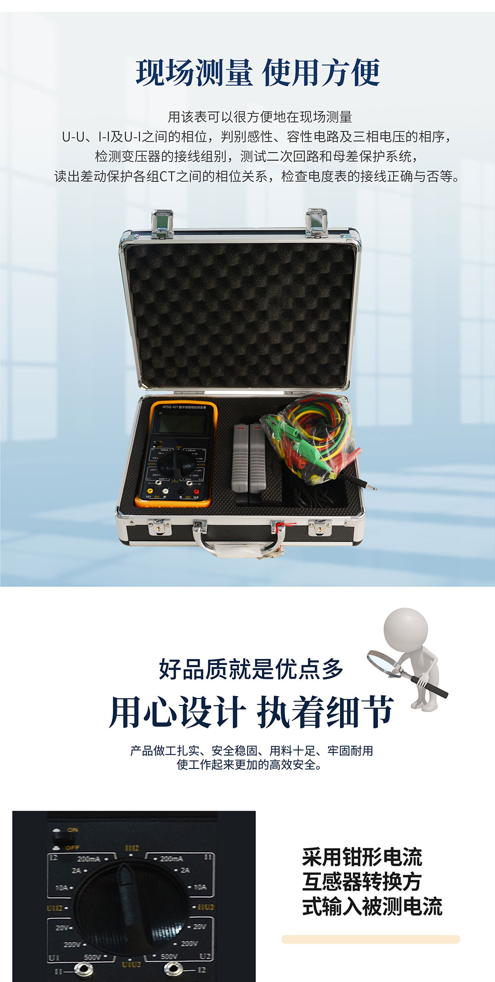 HZSQ-427數字雙鉗相位伏安表,是專為現場測量電壓、電流及相位而設計的一種高精度、低價位、手持式、雙通道輸入測量儀表。用該表可以很方便地在現場測量U-U、I-I及U-I之間的相位,判別感性、容性電路及三相電壓的相序,檢測變壓器的接線組別,測試二次回路和母差保護系統,讀出差動保護各組CT之間的相位關系,檢查電度表的接線正確與否等。采用鉗形電流互感器轉換方式輸入被測電流,因而測量時無需斷開被測線路。測量U1-U2之間相位時,兩輸入回路完全絕緣隔離,因此完全避免了可能出現的誤接線造成的被測線路短路、以致燒毀測量儀表。顯示器采用了高反差液晶顯示屏,字高達25mm,屏幕角度可自由轉換約70°,以獲得更佳視覺效果。數字雙鉗相位伏安表外殼采用工程絕緣材料,另配橡皮防振保護套,安全、可靠。執行標準:JJG440-2008。
