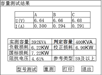 在測試結果界面按重測按鈕,則可重復一次測量。測試結果界面按打印按鈕,則可把測試結果以及備注界面錄入的信息打印輸出,若判定的型號為“S9及以上”時結果界面會顯示“型號測試”按鈕可以進一步準確判斷型號,之所以會出現“S9及以上”的結果是因為S9、S11和S13變壓器的負載損耗相同,若需測試具體型號還需“型號測試”結果。
