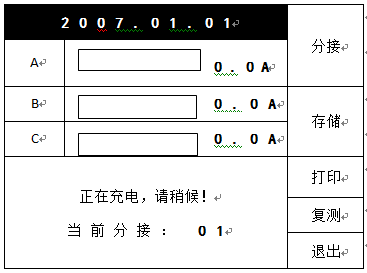 選擇好測量電流,接好三相接線,在初始界面狀態下按“測量”鍵后,直阻儀進入測量狀態,開始給繞組供電。并進入如下界面: