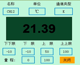 下圖為顯示畫面單個通道的具體內容,其中包含通道名稱、單位、測量值和報警標志四個部分。報警標志從上到下依次為上上限報警、上限報警、下限報警、下下限報警。數值正常時,報警標志為綠色,當超過報警值時,對應的報警標志會由綠色變為紅色(或者是:出現報警時,對應的報警標志會由綠色變為紅色)報警值可以在參數設置里設置。