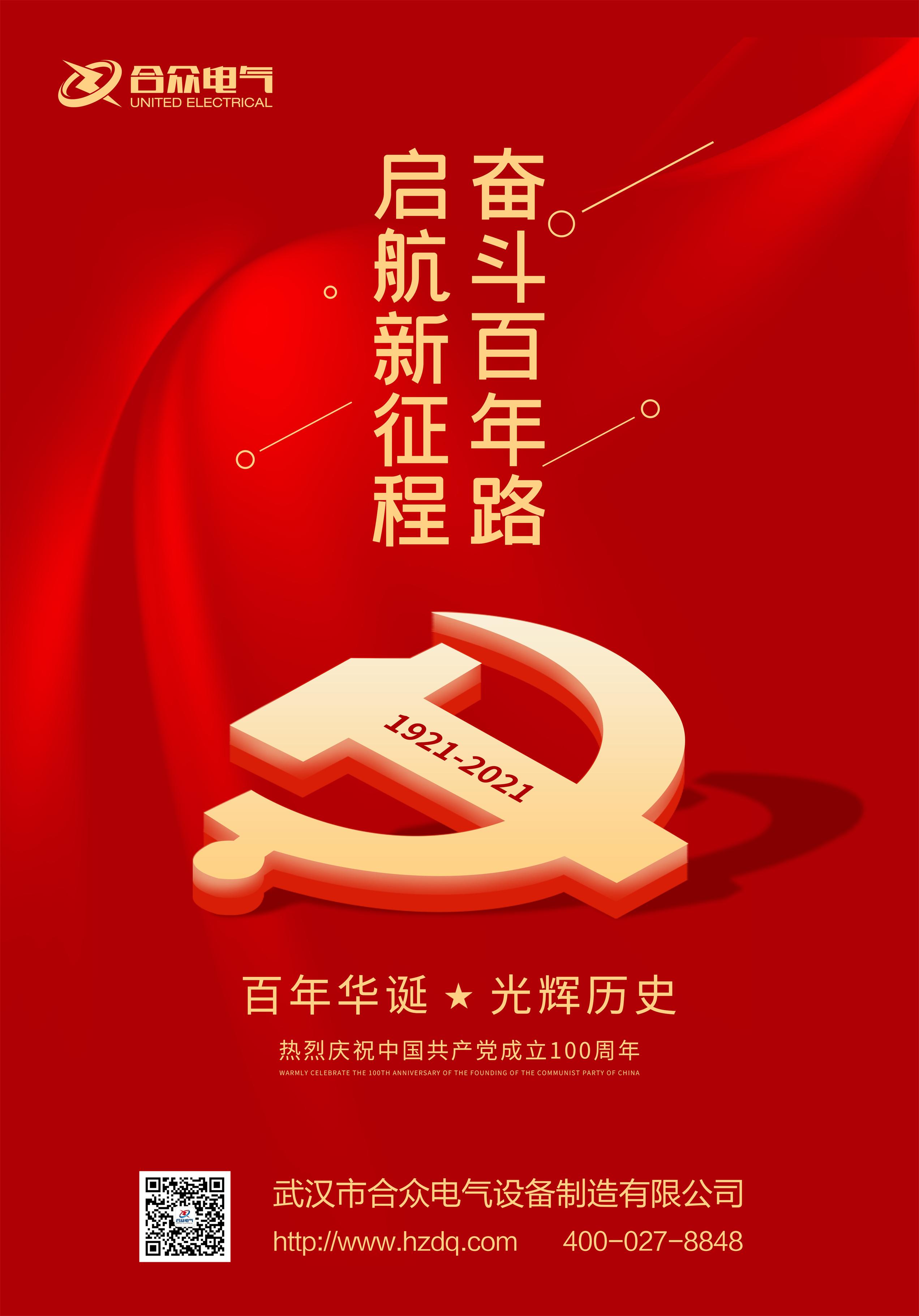 從1921到2021,一百個春秋,一百度風雨,一百載希望。1921至2021,更迭的是歲月,不變的是中國夢。中國共產黨,一個民族的引路人,必定在風雨中成長,在學習中進步,值此建黨100周年華誕之際,武漢市合眾電氣祈愿她意氣風發,陽光健康!