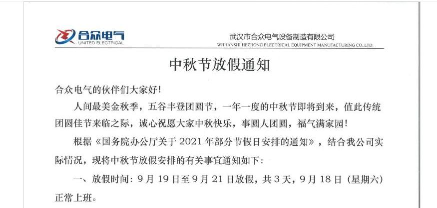 根據(jù)《國務(wù)院辦公廳關(guān)于2021年部分節(jié)假日安排的通知》,結(jié)合我公司實際情況,現(xiàn)將中秋節(jié)放假安排的有關(guān)事宜通知如下: