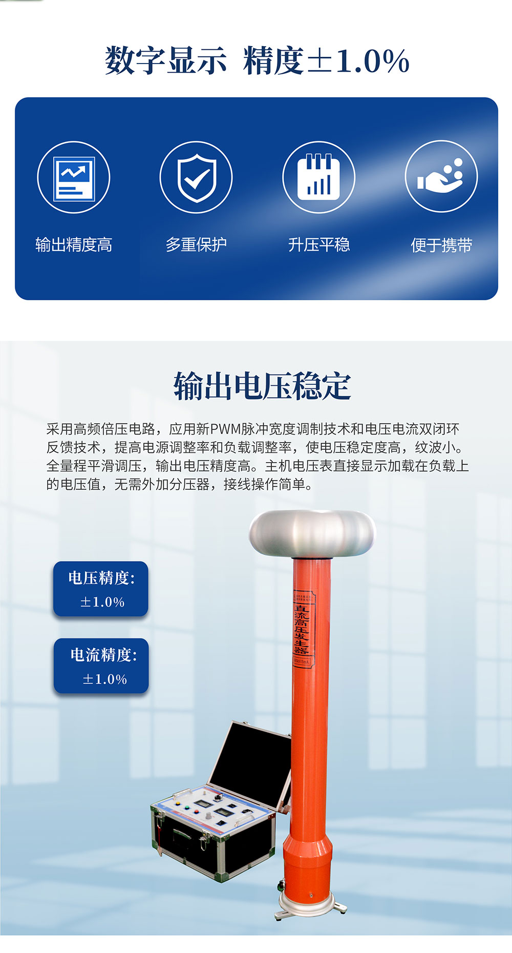采用了高頻倍壓電路,應用了新的PWM高頻脈寬調制技術,閉環調整,采用了電壓大反饋,使電壓穩定度大幅度提高。使用性能卓越的大功率IGBT器件及驅動技術,并根據電磁兼容性理論,采用特殊屏蔽、隔離和接地等措施。使直流高壓發生器實現了高品質、便攜式,并能承受額定電壓放電而不損壞。具有輸出功率大、體積小的特點,有可靠的過壓、過流及零位合閘保護功能,帶0.75倍電壓切換功能。