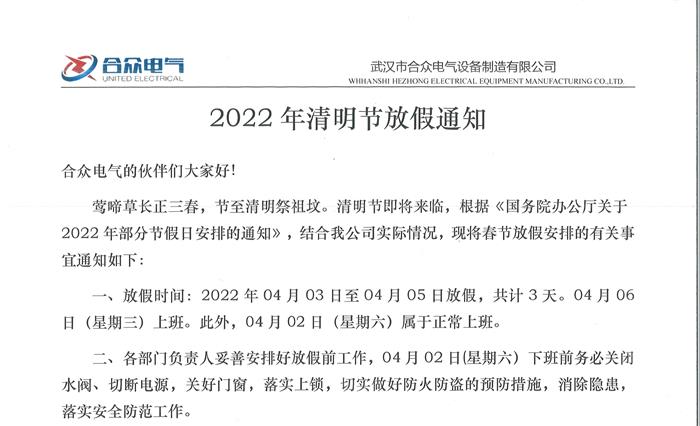 武漢市合眾電氣2022年清明節放假通知