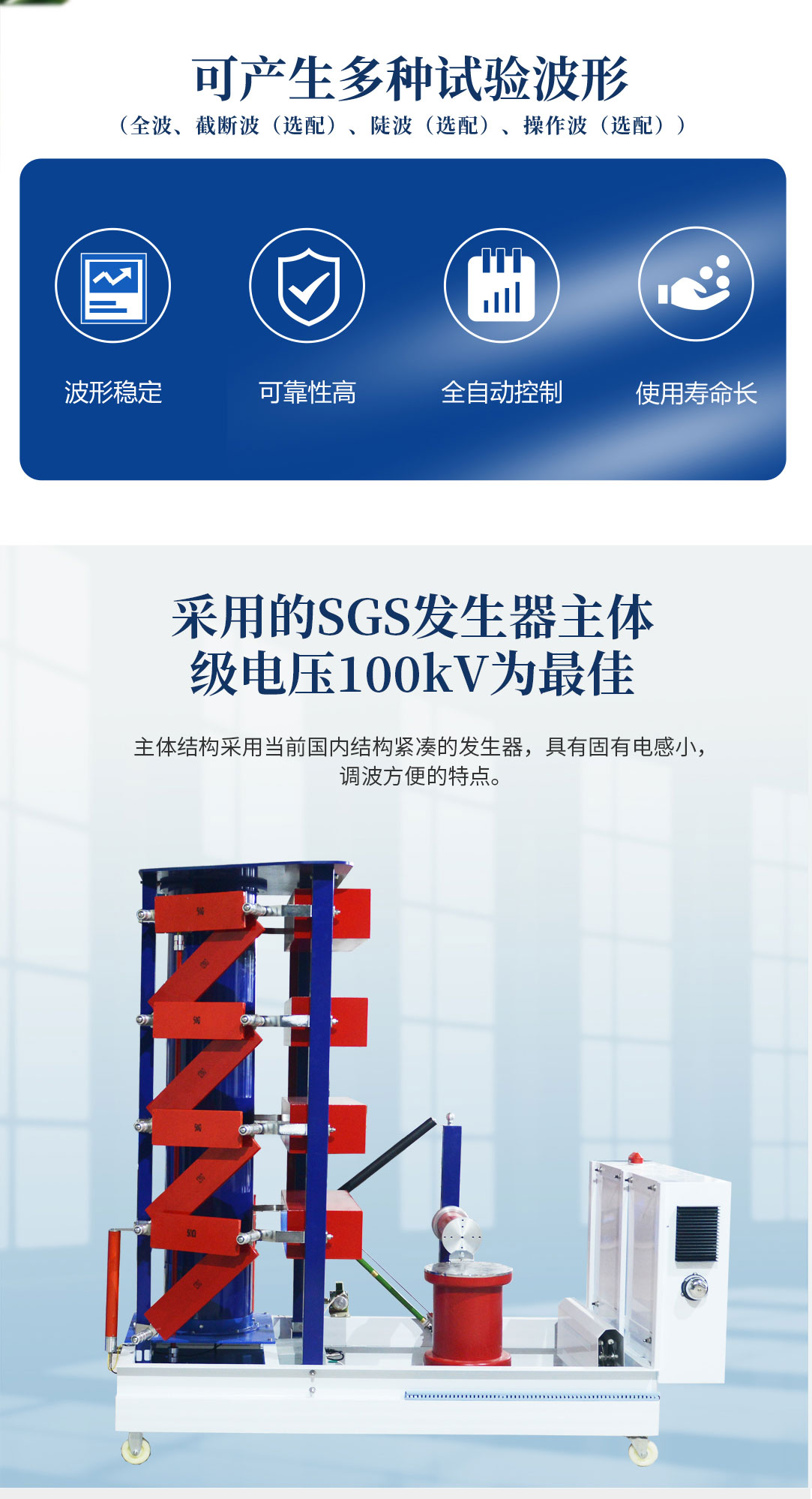 1、采用的SGS發(fā)生器主體,級(jí)電壓為100kV,符合當(dāng)前國(guó)內(nèi)外的發(fā)展趨勢(shì)。主體結(jié)構(gòu)采用當(dāng)前國(guó)內(nèi)結(jié)構(gòu)緊湊的發(fā)生器,具有固有電感小,調(diào)波方便的特點(diǎn)。