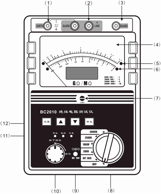 5000V/2GΩ~200 GΩ(刻度讀數×10)。