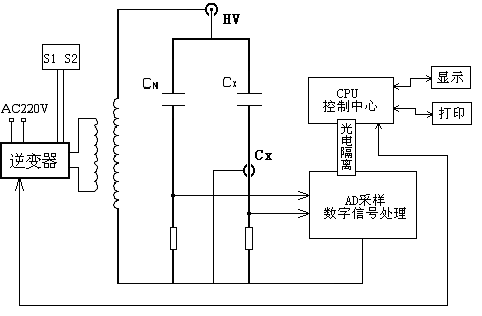 在交流電壓作用下,電介質要消耗部分電能,這部分電能將轉變為熱能產生損耗。這種能量損耗叫做電介質的損耗。當電介質上施加交流電壓時,電介質中的電壓和電流間成在相角差ψ,ψ的余角δ稱為介質損耗角,δ的正切tgδ稱為介質損耗角正切。tgδ值是用來衡量電介質損耗的參數。儀器測量線路包括一標準回路(Cn)和一被試回路(Cx),如圖1所示。標準回路由內置高穩定度標準電容器與測量線路組成,被試回路由被試品和測量線路組成。測量線路由取樣電阻與前置放大器和A/D轉換器組成。通過測量電路分別測得標準回路電流與被試回路電流幅值及其相位差,再由數字信號處理器運用數字化實時采集方法,通過矢量運算得出試品的電容值和介質損耗正切值。